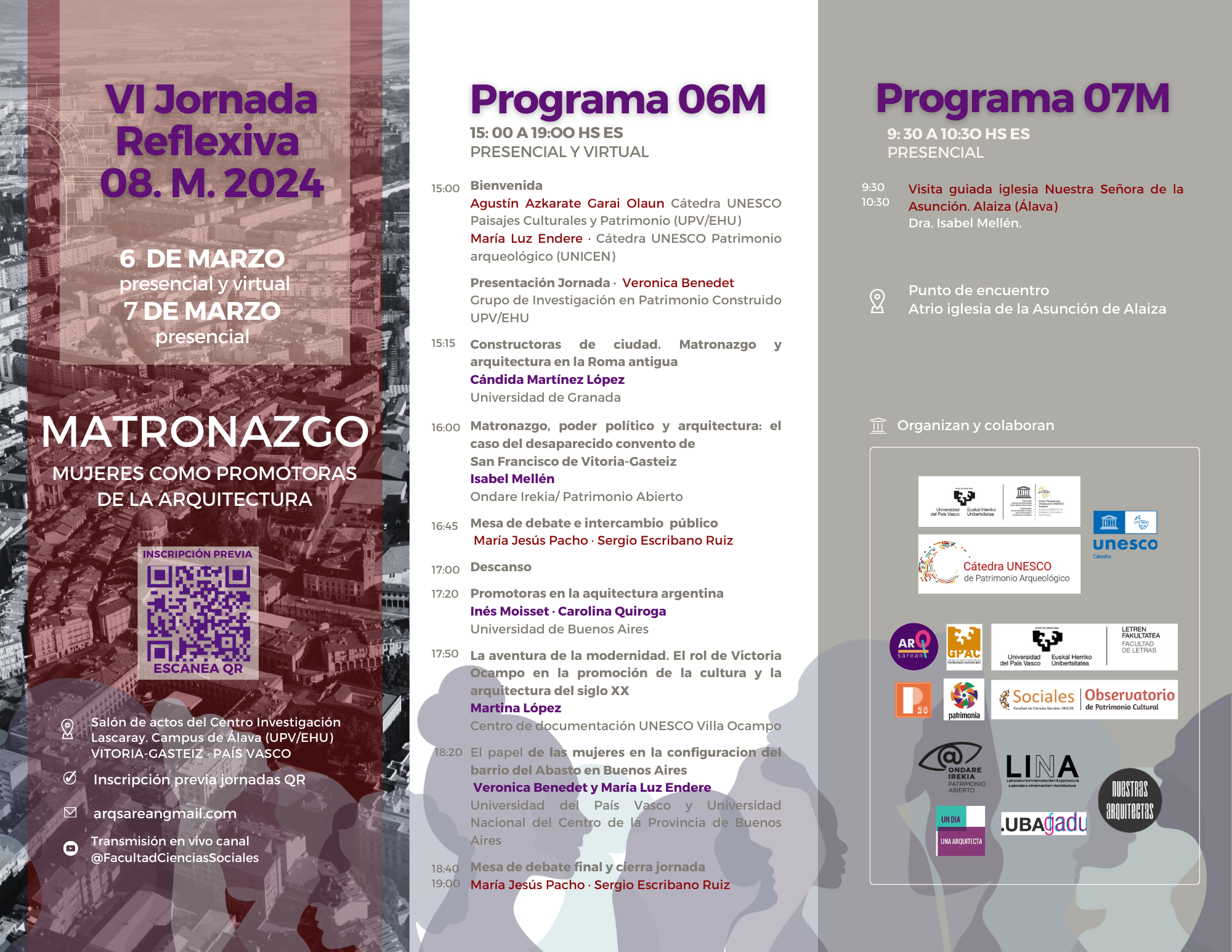 En conmemoración al «Día Internacional de la Mujer», desde 2019 venimos realizando estas jornadas reflexivas organizadas por ARQsarean (plataforma feminista de divulgación y visibilización de la Arquitectura, Urbanismo y Patrimonio) con el apoyo de nuestros grupos de investigación de la Universidad del País Vasco, Grupo de investigación en Patrimonio Construido (GPAC) y Cátedra UNESCO Paisajes Culturales y Patrimonio y este año con la colaboración internacional de la Cátedra UNESCO en Patrimonio Arqueológico de la Universidad Nacional del Centro de la Provincia de Buenos Aires (UNICEN).Asimismo, nos acompañan las siguientes instituciones nacionales e internacionales: Patrimonia-INCUAPA (UNICEN), Observatorio de Patrimonio Cultural (UNICEN), Ondare Irekia/Patrimonio Abierto, Patrimonio siglo XX y los colectivos feministas “Nuestras Arquitectas”, “Programa GADU (FADU-UBA)”, “Un día, Una Arquitecta” y la plataforma “LINA> laboratorio: intervención+arquitectura”. Este año contamos con la financiación de la Facultad de Letras de la UPV/EHU