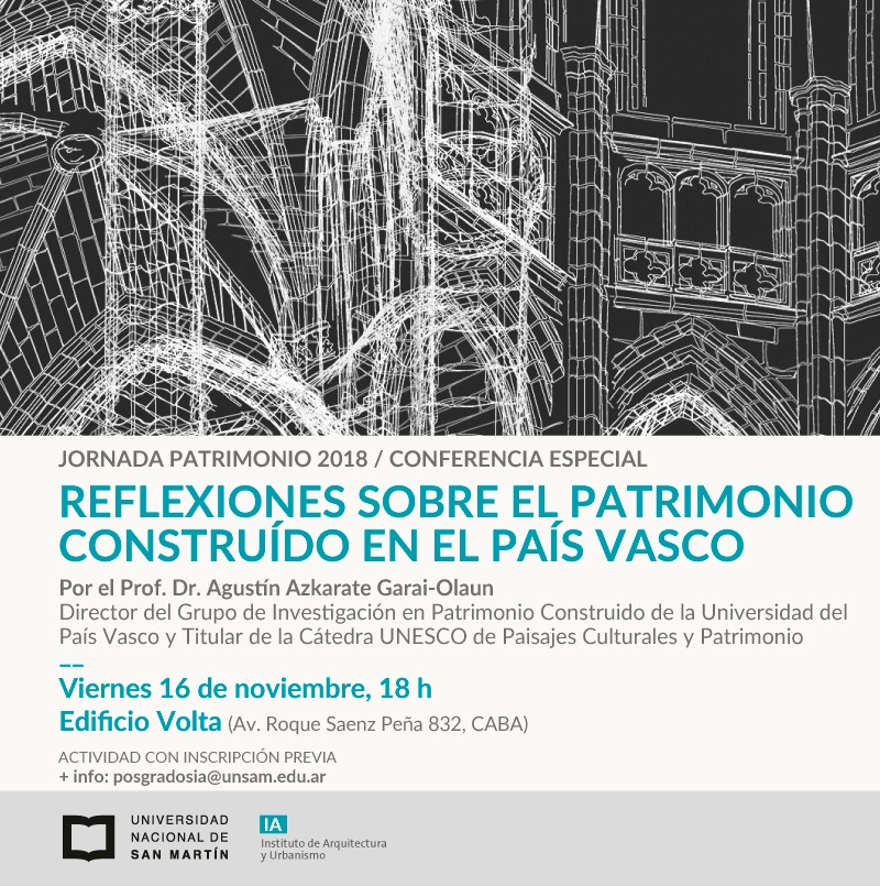 Como parte de la Jornada Patrimonio 2018 organizada por Universidad Nacional de San Martín (UNSAM) Buenos Aires (Argentina) y el Instituto de Arquitectura y Urbanismo, nuestro director Agustín Azkarate, dará una conferencia el próximo viernes 16 de noviembre, bajo el título de “Reflexiones sobre el patrimonio construido en el País Vasco”.