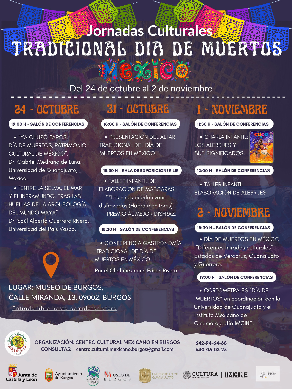 El pasado 24 de octubre nuestro compañero Saúl Alberto Guerrero Rivero impartió la conferencia “Entre la selva, el mar y el inframundo. Tras las huellas de la arqueología del mundo maya” en colaboración con el Centro Cultural Mexicano de la ciudad y el Museo Arqueológico de Burgos en el marco de la celebración del «Día de Muertos en México». Esta actividad de divulgación tuvo lugar en el Museo Arqueológico de Burgos.