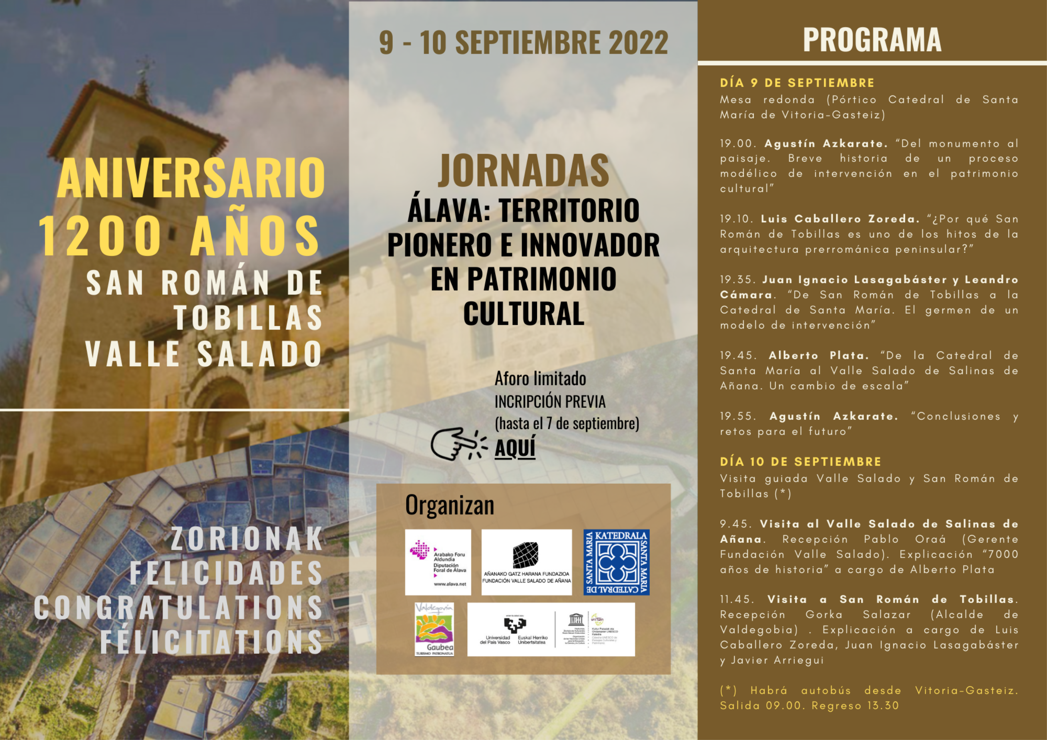 En conmemoración de los 1200 años de la fundación de la iglesia de San Román de Tobillas y de la primera mención escrita del Valle Salado de Salinas de Añana se celebrarán las Jornadas “ALAVA: TERRITORIO PIONERO E INNOVADOR EN PATRIMONIO CULTURAL” los días 9 y 10 de septiembre. En el evento organizado la Diputación Foral de Álava, la Fundación Catedral Santa María, Fundación Valle Salado, Turismo Valdegobia y nuestra cátedra, participarán reconocidas personalidades relacionadas con estos dos hitos históricos y el patrimonio cultural alavés.