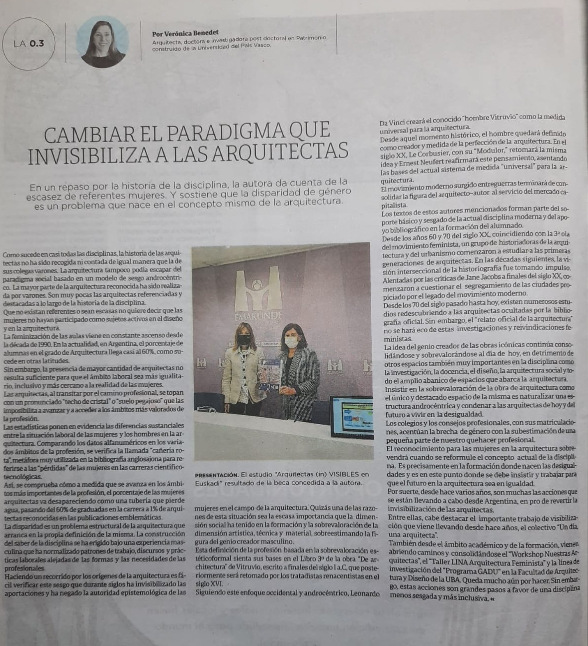 El martes pasado en el suplemento de Arquitectura ARQA del diario Clarín de Argentina han publicado un artículo de nuestra compañera Veronica Benedet sobre la problemática de las arquitectas en Argentina. Les dejamos unas imágenes de la versión impresa del articulo. Pueden leer este artículo desde el link de academia.edu de la autora: AQUI