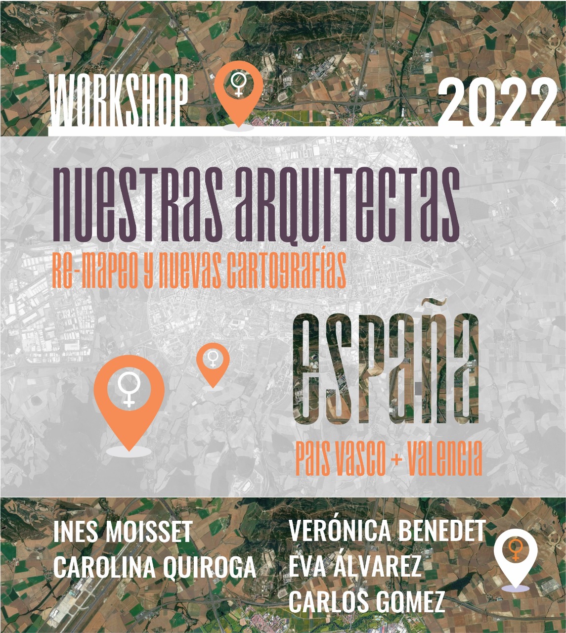 Flyer del próximo “Workshop Nuestras Arquitectas” coordinado por Inés Moisset y Carolina Quiroga a realizarse en 2022 en País Vasco junto a Veronica Benedet y en Valencia con Eva Álvarez y Carlos Gómez como anfitrones
