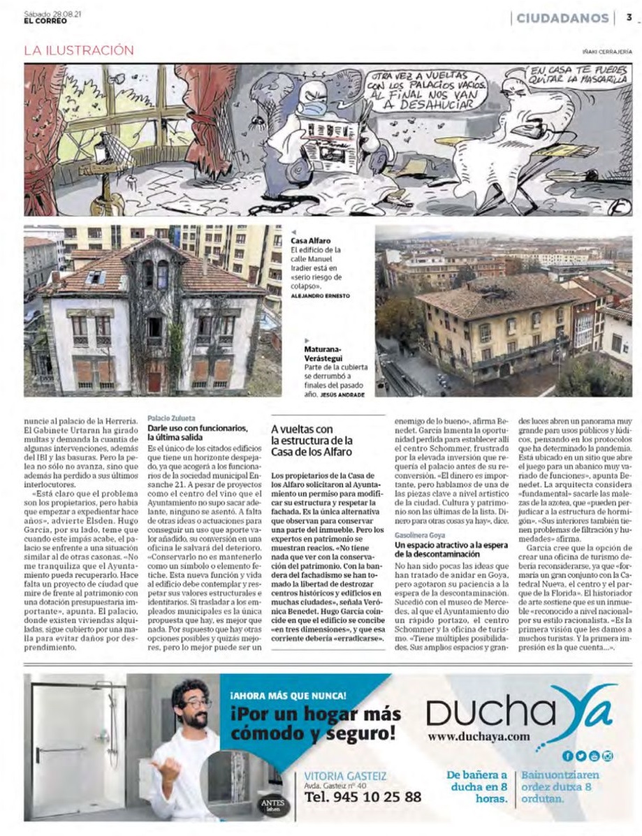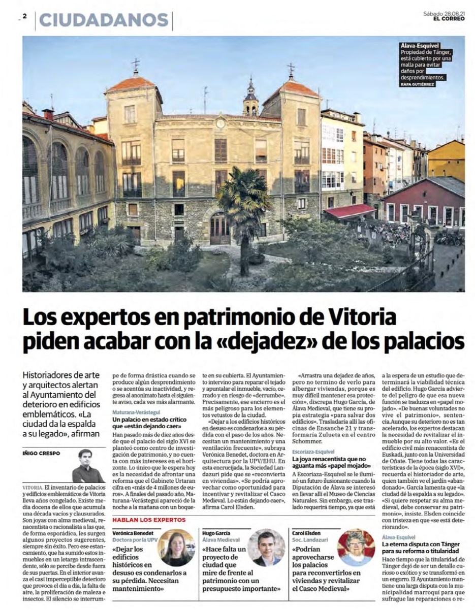 El pasado sábado 28 de agosto se publicó en el periodo El Correo un artículo muy interesante sobre la problemática que sufren varios edificios con valor patrimonial ubicados en el Casco Viejo y Ensanche del XIX de la ciudad de Vitoria- Gasteiz. Nuestra compañera Veronica Benedet fue invitada a opinar sobre esta situación, junto a otras personas especialistas, el historiador Hugo García de la Asociación Álava medieval y la directora de la Sociedad Landazuri, Carol Elsden.