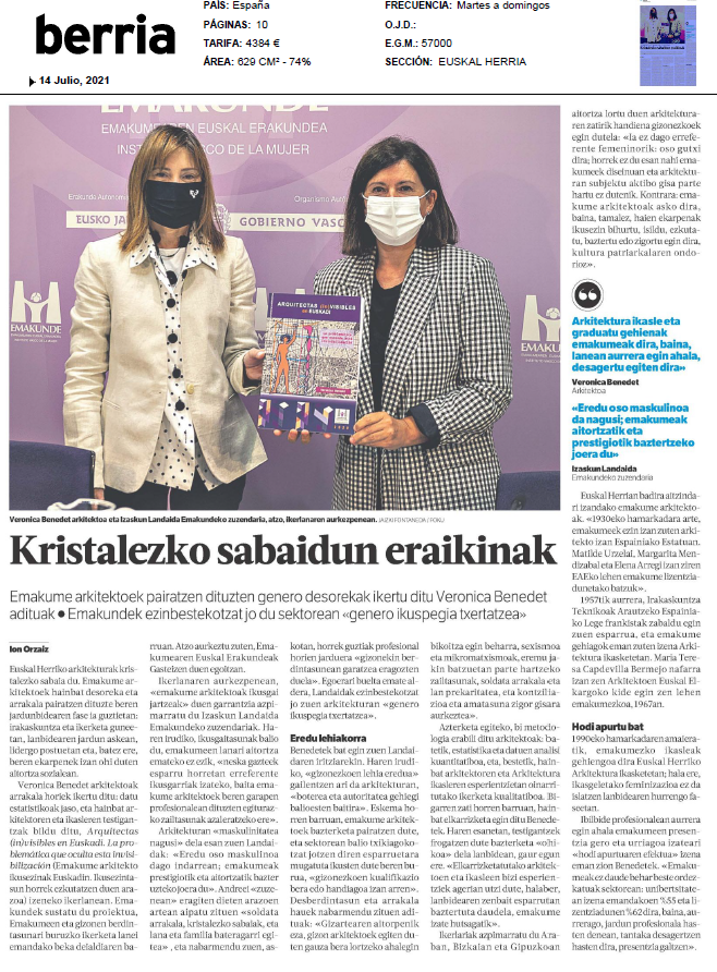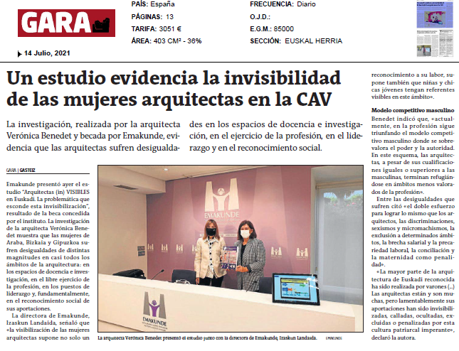El pasado 13 de julio, nuestra compañera Veronica Benedet ha presentado el estudio pionero “Arquitectas (in) VISIBLES en Euskadi. La problemática que esconde esta invisibilización”, resultado de la beca concedida a trabajos de investigación en Igualdad de Mujeres y Hombres de Emakunde en 2019.