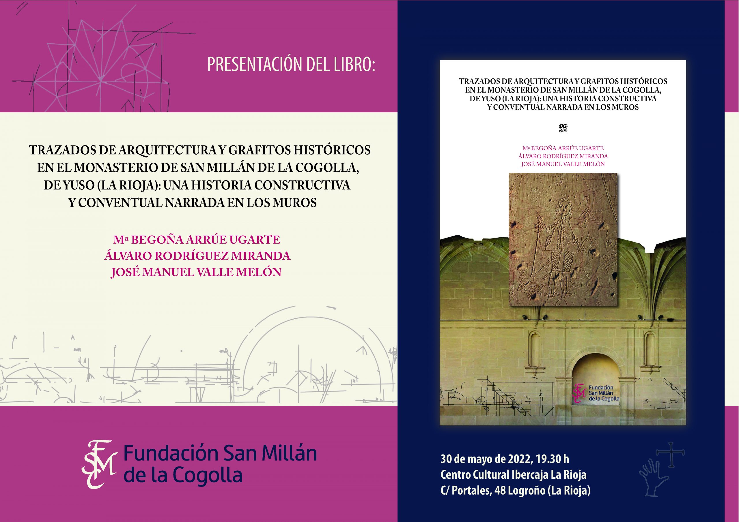 El próximo 30 de mayo a las 19.30hs se presentará el libro “Trazados de Arquitectura y Grafitos históricos en el Monasterio de San Millán de la Cogolla, de Yuso (La Rioja): Una historia constructiva y conventual narrada en los muros” en el Centro Cultural Ibercaja La Rioja ubicado en la calle Portales 48 en Logroño (La Rioja). La autoría de la publicación corresponde a Mª Begoña Arrúe Ugarte, Álvaro Rodríguez Miranda y José Manuel Valle Melón.