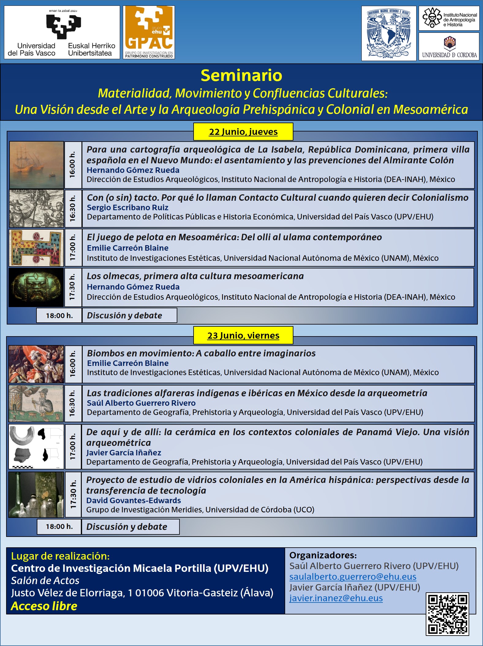 Os invitamos al Seminario Materialidad, Movimiento y Confluencias Culturales: Una Visión desde el Arte y la Arqueología Prehispánica y Colonial en Mesoamérica organizado por nuestros compañeros Saúl Alberto Guerrero Rivero  y Javier García Iñañez  donde se expondrán y debatirán sobre los procesos de contacto cultural entre la Península Ibérica y el Continente Americano a partir del siglo XV y XVI. El seminario será on-line y presencial en el Salón de Actos del Centro de investigación Micaela Portilla en el Campus de Álava de Vitoria-Gasteiz. La cita es el jueves 22 y el viernes 23 de junio de 16 a 18 hs. Os esperamos!