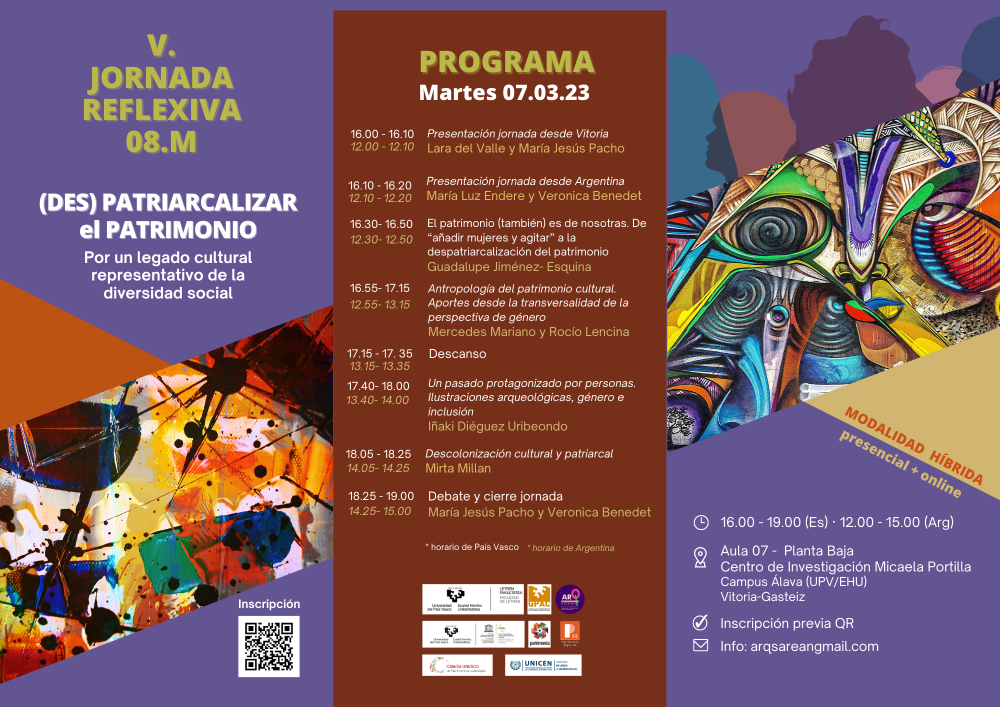 El coloquio y debate del martes 7 de marzo (16 hs a 19hs) será en modalidad híbrida (presencial y virtual). Presencialmente se realizará desde el Centro de Investigación Micaela Portilla en el campus de Álava y en conexión con una mesa del otro lado del atlántico que se celebrará en la Facultad de Ciencias Sociales de la Universidad del Centro de la Provincia de Buenos Aires en Olavarría (Argentina). La mesa desde el Campus de Álava estará coordinada por Lara del Valle y María Jesús Pacho. La segunda mesa estará coordinada por nuestra compañera de GPAC y Cátedra UNESCO Paisajes Culturales y Patrimonio, Veronica Benedet y María Luz Endere, directora de la Cátedra UNESCO de Patrimonio Arqueológico y del grupo de investigación PATRIMONIA (INCUAPA- CONICET) desde el Campus de UNICEN en Olavarría (Argentina).